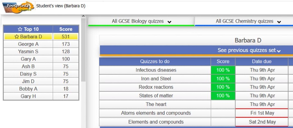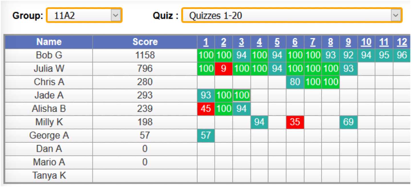 View live student scores for each assigned quiz.